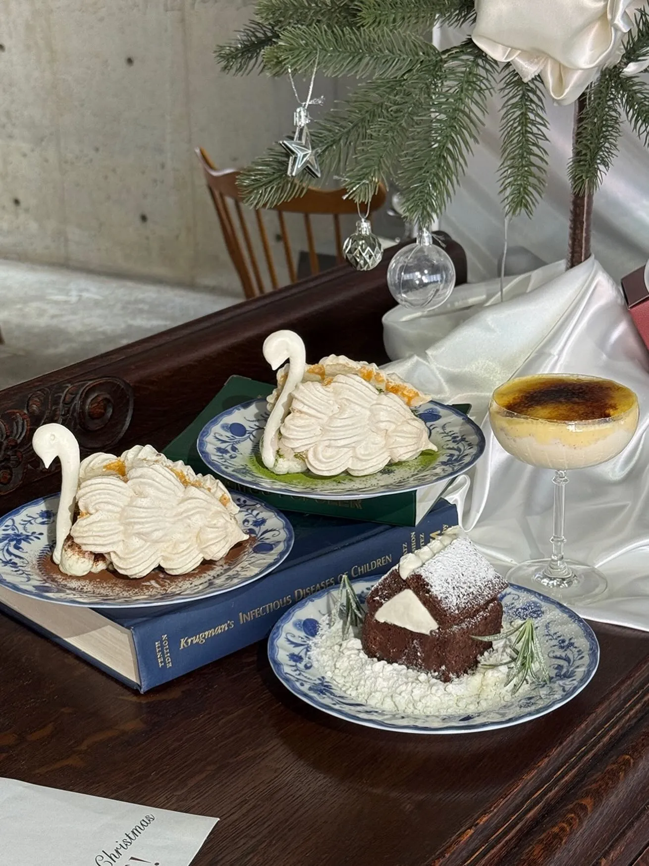 仕上げには、アーモンドプードルを加えたスワン型のメレンゲを添えて。